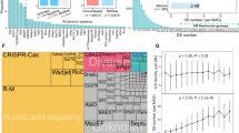 Additional distinctive features of CPR bacteria were further explored. One of the most important traits was the presence of introns, which set CPR apart from other non-CPR bacteria2. Among the 399 CPR MAGs, 73.4% were predicted to harbor 16S rRNA genes, and the absence of 16S rRNA in the rest, 26.6%, was possibly attributed to genome incompleteness. Of those containing 16S rRNA genes, 15.4% contained a total of 56 introns (Supplementary Table 10), indicating the widespread intron distribution of CPR bacteria. Many of these introns encode RNA-based self-splicing ribozymes (Group I catalytic introns) and/or amino-acid-based LAGLIDADG homing endonucleases, suggesting potential roles in gene expression regulation or ribosomal function. Another notable feature of CPR bacteria is the scarcity of CRISPR-Cas systems in their genomes, with only 1.4% of publicly available CPR MAGs reported to possess CRISPR arrays59. Likewise, only three CPR MAGs in the ATWR were identified with genes encoding cas3, cas5, or cas7, indicating the absence of CPR CRISPR-Cas systems in this aquifer. Consistent with a previous study57, we identified low gene occurrences and even gene losses in CPR genomes, particularly in biosynthesis genes responsible for essential amino acids, fatty acids, and nucleotides (Supplementary Table 11). This finding underscores the significance of genomic streamlining in the evolution of CPR genomes, which may facilitate the minimization of cellular complexity and ultimately result in a decrease in genome size60. Meanwhile, the absence of CPR CRISPR-Cas systems could also be the consequence of genomic streamlining for high metabolic efficiency. Interestingly, the lack of CRISPR-Cas systems could position CPR bacteria as “viral decoys” for their hosts, thereby potentially protecting the hosts and reducing their viral load59.