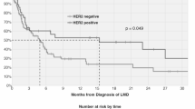 Table 3 shows the results of a proportional hazards regression using 67 patients of the 77 patients shown in Fig. 5 with complete covariate information for all potential predictors of interest. Among the 67 patients, 40 deaths were observed. System disease progression before the LM at six months is statistically associated with the time to death (HR with 95% CI 7.40, 3.10–17.63; p < 0.0001) after adjusting for all other factors included in the model.