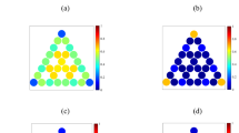 where \(S\) is the area of the first Brillouin zone, \({A}_{j}=-i\langle \psi | \partial {k}_{j}| \psi \rangle\) is Berry connection with \(j=x,y\), and \(\psi\) is the wave function for the lowest band. We have numerically calculated the polarization and find \(({P}_{x},{P}_{y})=(0.499,0.288)\) for \({d}_{1}=2.08r\) and \({d}_{2}=3.60r\) and \(({P}_{x},{P}_{y})=(0.032,0.047)\) for \({d}_{1}=3r\) and \({d}_{2}=2.1r\). The former corresponds to the topological insulating phase while the latter is for the trivial phase. Theoretically, the polarization \(({P}_{x},{P}_{y})\) is identical to the Wannier center, which is restricted to two positions for insulating phases. If Wannier center coincides with (0, 0), the system is in the trivial insulating phase and no topological edge states exist. Higher-order topological corner states emerge when the Wannier center lies at (1/2, 1/2\(\sqrt{3}\)).10,15 The distribution of bulk topological index is consistent with the computed phase diagram Fig. 2c.