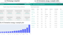 Machine learning models are mainly trained using Scikit-learn61, Keras62, and LightGBM63 (TensorFlow backend) software. For DFT generated scalar data such as formation energies, bandgaps, exfoliation energies etc. the crystal structures are converted into a Classical Force-field Inspired Descriptors (CFID) input array and the DFT data is used as target data, which is then train-test split in a ratio of 90: 10. Preprocessing such as ‘VarianceThreshold’, ‘StandardScalar’ are used before ML training. Regression models’ performance are generally reported in terms of Mean Absolute Error (MAE) or r2, while that for classification models using the Receiver Operating Characteristic (ROC) Area Under Curve (AUC) value which lie between 0.5 and 1.0. Several other analyses such as feature importance, k-fold cross validation and learning curve are carried out after the model training. The trained model is saved in pickle and joblib formats for model persistence. All the web-apps are developed using JavaScript, Flask, and Django packages69.