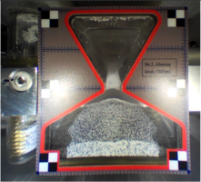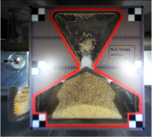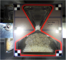 Table 1 Snapshots of granular materials in microgravity. The hourglass image represents the final state of the flow when the granular media flows from the narrow area to the wide area (hopper angle is 60°) in 0.063 G. The mass of the granular media m summarised in Table 1 is determined by the following equation: m = V60 ρmin, where V60 represents 60 % of the total volume of the narrower space of the hopper (the side of the hopper angle being 60 degrees), and ρmin is the minimum bulk density of the granular media (Supplementary Table 1). The value of V60 (60 %) is conservatively determined to avoid the overflow of the granular media.