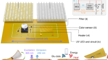 In contrast to implantable sensors, non-invasive sensors can monitor glucose level by measuring body fluids, i.e., tears and sweats77,78,79,80. Studies have shown that there are glucose transporter proteases in human cornea and glucose can be transported by these proteases from blood to tears. Hence, blood glucose level can be monitored non-invasively via tears81. Apart from tears, blood glucose level can also be monitored via sweats as blood vessels around sweat glands are highly developed82. Contact lenses are one of the most representative non-invasive approaches to monitor glucose level via tears. Elsherif et al. reported PBA glucose sensing-based contact lenses that had laser-inscribed array structure imprinted on them for light diffusion. Light diffusion through the hydrogel is dependent on volumetric expansion of the hydrogel responding to glucose concentration83. Glucose concentration can then be detected by measuring the intensity of optical light diffused through the hydrogel. The diameter of diffused light spot reduces as glucose concentration increases.