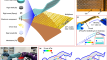 The fabrication process of a multi-axial sensor began with mounting a NTC thermistor (NTCG064EF104FTBX, TDK Corporation, Japan) onto the backside of fPCB (PI/Cu/PI, 35/44/35 μm in thickness) using solder paste (SMDLTLFP10T5, Chip Quick, Canada) for electrical connection (Supplementary Fig. 4). A rigid substrate (silicon wafer; 8 × 8 × 0.25 mm3), a glass substrate (glass wafer, 3 × 2 × 0.25 mm3), a cantilever strain gauge (PI/Au/PI, 2 × 1.2 × 0.07 mm3) and a rigid cover (Poly(methyl methacrylate) (PMMA), 7 × 7 × 0.25 mm3) were cut using the UV laser system. Then, the rigid substrate (silicon wafer; 8 × 8 × 0.25 mm3) was bonded onto the backside of fPCB, and the glass substrate was bonded onto the topside of fPCB using the epoxy resin (1365868-6, Loctite, USA) and silver epoxy (8331-14 G, MG chemicals, Canada). Likewise, four cantilever strain gauges were bonded using the same epoxy resin and silver epoxy. A soft cover (polydimethylsiloxane (PDMS; Sylgard 184, Dow Inc., USA); 8 × 8 mm2) was chemically treated to enhance adhesion using (3-Mercaptopropyl)trimethoxysilane (MPTMS; 175617, Sigma–Aldrich, USA)49. The soft cover (PDMS) and the rigid cover (PMMA) were then bonded using the epoxy resin.