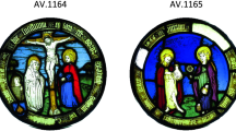 The stained glass windows transmit the light through glass pieces that can be transparent or translucent, raw, colored in the mass through the addition of chromophore elements such as Cu, Fe, Mn, Co, etc.1,2,3,4,5,6, flashed (red glass) or decorated on the surface (with grisaille, yellow stain, enamels, engravings or cold paint). Grisaille, an opaque glass paint, was widely used in the thirteenth century too. It consists of a colorant (usually Cu and/or Fe oxides), a flux (usually leaded glass) and a binder (e.g. vinegar, gum arabic). In France, yellow stain, obtained with silver salt mixed with a binder, appeared at the beginning of the fourteenth century7. Many glass pieces (between 2 and 4 mm thick) are mounted side by side and are held together by a lead came, constituting a panel. The panel is then fixed and strengthened by an ironwork (saddle-bars sealed in the masonry, lug bars, cover plates, wedges)8.
