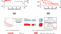 Where \({\widetilde{\varepsilon }}^{* }\) corresponds to the unconstrained volumetric expansion, \(\xi\) is the ratio of fluence at energy E > 10 keV against the integrated fluence, and \({T}_{{irr}}\) denotes the irradiation temperature (25–40 °C). It is assumed here that the ion irradiation-induced heating is dissipated by convection.
