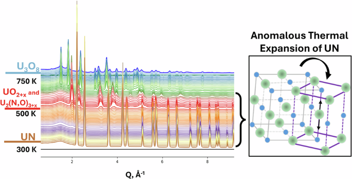 The oxidation pathway of UN under air has been studied with varying results, typically including some phase assemblage including UO2, UO3, U3O8, and/or U2N332. The variety of methods, conditions, and samples used make it difficult to draw broad conclusions. Our past study on the thermal oxidation of UN suggested the formation of UO3 as an intermediate oxidation product, while in other studies only UO2 or U3O8 are reported10,11,33,34. U2N3 has been observed in some studies as a surface phase, typically the α polymorph, sandwiched between UN and UO29,33,34,35. Notably, many studies rely on techniques that do not directly probe the phase assemblage during heating. For example, UO3 was hypothesized from a thermogravimetric analysis (TGA) study, which used similar thermal oxidation conditions, where such a phase cannot be directly confirmed but rather back calculated33. From this study, we can reject such a hypothesis. This combination of in situ high-T XRD and the past TGA studies suggested that the observation of “UO3” during TGA may be a mass-equivalent UO2-based mixture with the inclusion of nitrogen gas or other X-ray amorphous phases. This was confirmed by the identification of UN, UO2+x, and α-U3O8 at various temperatures with no signs of UO3 (Fig. 5).