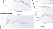 FOOOF optimally fits the PSD with a function composed of the sum of an aperiodic part and a periodic part. The aperiodic part is modelled as \(\frac{\kappa }{{f}^{\lambda }}\) where f > 0 Hz is the frequency, κ is the offset of the PSD, and λ defines how the PSD decays as a function of f. The periodic part is modelled as a sum of P weighted Gaussian distributions whose mean, standard deviation and weight, respectively, indicate the peak frequency, width and height of the spectral power bump of the peak. We manually specified the frequency band (1–45 Hz) on which the fitting was done. To identify oscillatory peaks in the PSD using FOOOF, we need to provide the maximum number of peaks P, their minimum height and bandwidth. We searched for P = 4 peaks with a minimum peak height of 100.2 V2/Hz and peak width within [1, 10] Hz (see Fig. 5c). Thus, we obtained \({f}_{peak}^{1},\ldots ,{f}_{peak}^{4},\) for each channel and subject. For Fig. 1a, we pooled all \({f}_{peak}^{1},\ldots ,{f}_{peak}^{4},\) for all channels and subjects in each group.