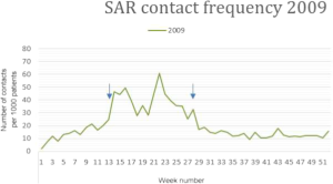 To define ‘peak-periods’ (Box 1), we additionally expressed the ‘SAR contact frequency’ as a weekly measure: the ‘weekly contact frequency’. The number of ‘SAR related encounters’ was assessed for each separate week number and then divided by ‘SAR patient years’ in that particular year.