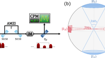 Our second step, shown in Fig. 2d–f, is to measure the effectiveness of optical injection locking using a CW seed. We bring the Master and Slave lasers into resonance using integrated heaters. Injection locking occurs at optical powers such that light injected from the Master laser overcomes spontaneous emission in the Slave laser’s cavity. Jitter and chirp are then suppressed and the Slave pulses lock to the phase and wavelength of the Master. In the case of a CW Master laser described by \(Pe^{i\omega _Mt}\), with frequency ωM and power P, the phase difference between consecutive pulses is fixed to Δθ = ωMT where T is the repetition period. Hence the corresponding IQ diagram is a vector of constant intensity and phase (Fig. 2e). The DFB lasers were measured to have a linewidth <35 fm (<4.5 MHz) in CW, which is limited by the resolution of our optical spectrum analyser. This yields a coherence time in the 100 ns range which exceeds by far our repetition period T = 500 ps. The coherence transfer is evidenced by resolving interference fringes at the output of the tuneable AMZI. In Fig. 2f, we show that we measure interferences fringes with 98.3% visibility when the injection is ON and that the interferences are suppressed when the injection is OFF.