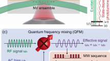 The experiments are performed using a single NV center in ultrapure diamond (Fig. 2a). Here we use a 400 G magnetic field, aligned along the NV symmetry axis, to lift the degeneracy of the three ground spin states and we use two of these states (here denoted as \(\left| 0 \right\rangle ,\;\left| 1 \right\rangle\)) as a qubit. We initialize our qubit into a coherent superposition state and map the sensor phase φ = 2α (compare Eq. (3)), acquired during interaction with the control sequence and the signals, into a population difference (such that the probability for the sensor to be projected to \(\left| 0 \right\rangle\) reads \(P = 0.5 \cdot \left( {1 - \sin \left( \varphi \right)} \right)\), which is subsequently read out optically.