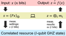 Specifically, consider an experiment E aimed at robust self-testing of the N qubit GHZ state using N party MABK Bell expression, \(\left\langle {{{{\mathcal{M}}}}}_{N}\right\rangle\). Suppose that the experiment yields the value \({\left\langle {{{{\mathcal{M}}}}}_{N}\right\rangle }_{E}={2}^{\frac{N-1}{2}}-\epsilon\), the fidelity \({{{{\mathcal{F}}}}}_{1}\) of the experimental state with the N qubit GHZ state optimal for \(\left\langle {{{{\mathcal{M}}}}}_{N}\right\rangle\) (Theorem 6) is proportional to \({2}^{\frac{N-1}{2}}-\epsilon\). However, the experimental imperfections will inevitably yield experimental behavior for which \({\left\langle {{{{\mathcal{M}}}}}_{N}^{{\prime} }\right\rangle }_{E}\ne 0\). Consequently, the experimental behavior will always be closer to the extremal point which attains \(\left\langle {\tilde{{{{\mathcal{U}}}}}}_{N}\right\rangle =\frac{{2}^{\frac{N-1}{2}}}{\sqrt{{({{{{\mathcal{U}}}}}_{N}^{{{{\mathcal{M}}}}})}_{E}}}({\left\langle {{{{\mathcal{M}}}}}_{N}\right\rangle }_{E}\pm \iota {\left\langle {{{{\mathcal{M}}}}}_{N}^{{\prime} }\right\rangle }_{E})\) as compared to the extremal point which attains \(\left\langle {{{{\mathcal{M}}}}}_{N}\right\rangle ={2}^{\frac{N-1}{2}}\) and \(\left\langle {{{{\mathcal{M}}}}}_{N}^{{\prime} }\right\rangle =0\). Hence, the fidelity of the experimental state with the target GHZ state \(\left\vert GH{Z}_{N}\right\rangle\) which realizes this extremal point (from Corollary 7.1) will yield a fidelity \({{{{\mathcal{F}}}}}_{2}\) proportional to \(\sqrt{{({{{{\mathcal{U}}}}}_{N}^{{{{\mathcal{M}}}}})}_{E}}=\sqrt{{({2}^{\frac{N-1}{2}}-\epsilon )}^{2}+{({\left\langle {{{{\mathcal{M}}}}}_{N}^{{\prime} }\right\rangle }_{E})}^{2}}\), such that, \({{{{\mathcal{F}}}}}_{2} > {{{{\mathcal{F}}}}}_{1}\). Hence, in general taking into account, Uffink’s quadratic and complex-valued Bell expressions provide for a more accurate and robust DI self-testing of the N qubit GHZ state as compared to the MABK inequalities, especially in cases when the relative phase is irrelevant to the application and could be arbitrary.