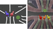 Both devices are fabricated on a 28Si/SiGe heterostructure, with a strain-relaxed Si0.7Ge0.3 buffer layer. On top of this an isotopically enriched 28Si quantum well is grown (residual 29Si concentration below 800 ppm) with a thickness of 8 nm and 7 nm for the 6D2S and 2 × 2 devices respectively. Then a 30 nm thick Si0.7Ge0.3 buffer layer is grown with a 1 nm silicon oxide cap. A gate stack consisting of three layers of Ti:Pd metallic gates is deposited and separated from the heterostructure by Al2O3, and separated from each other by 5 nm Al2O3. The metal gate film thickness is as described in ref. 59. Finally, another Al2O3 layer is deposited and a 200 nm thick Ti:Co micromagnet is fabricated.