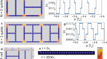 Two basic gate architectures have previously been proposed to implement topological quantum gates in 1D systems: a T-structure2 (Fig. 1a) and a loop structure14 (Fig. 1b). We demonstrate the feasibility of implementing gate protocols in both of these architectures in MSH systems, which can be built using atomic manipulation techniques on the surface of a 2D superconductor19, beginning with a \(\sqrt{{\sigma }_{z}}\)-gate—realizing the exchange of two MZMs—in a T-structure network of magnetic adatoms placed on the surface of a 2D superconductor, as indicated by white arrows and the blue area in Fig. 2a, respectively [the system consists of 600 sites with dimension (20a0 × 30a0)]. To reveal the fractional statistics of MZMs, it is necessary for the gate process to be adiabatic, thus avoiding excitations between the MZMs and topologically trivial bulk states. To this end, we choose a rotation time TR ≫ ℏ/Δt, where Δt is the topological gap in the system (the time-dependent gate protocol is given in the Methods Section), and present in Figs. 2a–d, the resulting zero-energy Nneq at successive times during the gate process together with the magnetic structure, shown as white arrows (the full time dependence of the entire gate process is shown in Supplementary Movie 1). At the initial time t = 0, two MZMs are localized at the ends of the topological horizontal segment of the T-structure (cf. Figs. 1a and 2a), while the vertical segment is trivial. The exchange of the two MZMs is then facilitated in three steps, as schematically shown in Figs. 2b–d. A comparison between the spatial form of Nneq and that of the magnetic structure, reveals as expected, that the spatial location of the MZMs follows the boundary between the network’s topological and trivial regions, as schematically shown in Fig. 1c. Once the braiding process is completed, Nneq exhibits the same spatial structure as in the initial state (see Fig. 2a). The resulting Majorana world lines (see Fig. 2e), obtained by projecting the zero-energy Nneq onto the real space x-axis, visualize the entire gate process in time and space (a 3D rendering of the world lines is presented in Supplementary Movie 2).