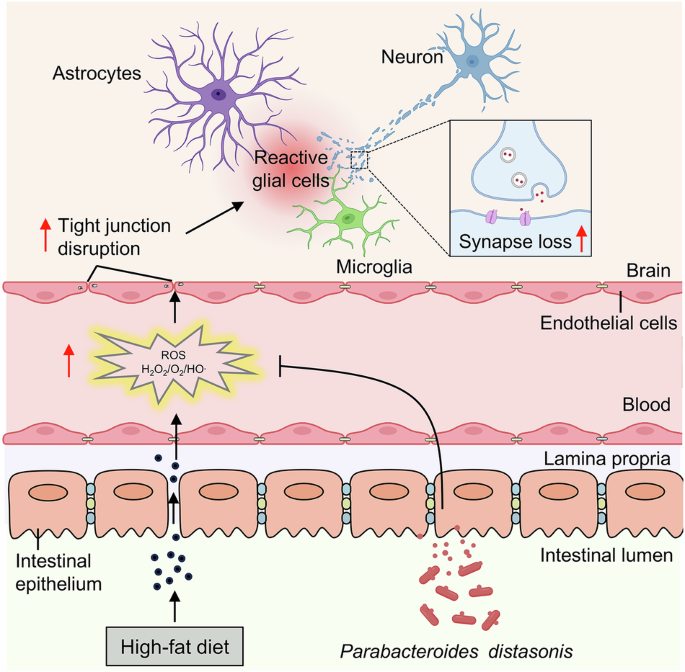 Recent studies have indicated the critical role of gut microbiota in regulating systemic insulin sensitivity and energy metabolism via the regulation of functional microbial metabolites in diabetic animal models and humans9,10,11. Moreover, gut microbiota homeostasis is essential for the maintenance of gut health and for modulating brain functions via the regulation of the permeability of the brain barrier, brain energy and immune homeostasis, and synaptic transmission12,13,14. The gut-brain axis links the health of the gut microbiota to central nervous system (CNS) function. Both pre-clinical and clinical studies have demonstrated that probiotics can restore healthy gut microbiota and improve CNS function through multiple coordinated actions involving the regulation of inflammation, the reinforcement of both gut and brain barrier function, and the modulation of neuroactive metabolites15,16,17,18. In addition to the probiotics, Parabacteroides distasonis (P. distasonis), an emerging gut-derived probiotic with therapeutic potential, has been demonstrated to alleviate diabetes, obesity, inflammatory bowel disease, hepatic fibrosis, and prevented non-alcoholic steatohepatitis through producing or stimulating host production of various active metabolites such as pentadecanoic acid, succinate, and bile acids19,20,21. These metabolites critically mediate cross-talk within the gut-brain axis by modulating signaling pathways that influence CNS functions22,23. Our previous studies have also revealed that P. distasonis can reduce the risk of diabetes in mice by regulating intestinal barrier function through the production of nicotinic acid24. Critically, high-fat diet (HFD) consumption is a well-established inducer of systemic oxidative stress, characterized by an imbalance between reactive oxygen species (ROS) production and antioxidant defense mechanisms. This heightened oxidative stress is a key pathogenic driver contributing to various metabolic dysfunctions25. Recent studies have suggested that diabetes is often accompanied by brain injury6, which may be mechanistically linked to HFD-induced oxidative stress and neuroinflammation. Consequently, oxidative stress and related inflammatory mediators serve as crucial indicators for assessing brain health in the context of metabolic disorders like those induced by HFD. However, despite the established role of P. distasonis in mitigating metabolic disturbances and its potential influence on redox balance in peripheral tissues24, its effects specifically on HFD-induced oxidative stress in the brain and the consequent brain dysfunction have never been previously reported.