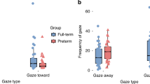 Regarding the auditory stimuli, whistle and yawn stimuli yielded similar reaction times in VPT children (Mwhistle = 593, SDwhistle = 115 vs Myawn = 617 SDyawn = 126, tWelch(53.6) = −0.73, p = 0.47, Cohen’s d = −0.19) and FT children (Mwhistle = 389, SDwhistle = 47.7 vs Myawn = 400 SDyawn = 49.7, tStudent(44) = −0.80, p = 0.43, Cohen’s d = −0.24).
