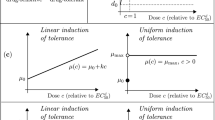 The model we utilize in this work has the same overall structure as the two-compartment model in Eqs. (8, 9), albeit with two notable modifications. The first is that, because we fit to in vitro data, we converted the logistic growth terms to exponential growth. The second change is motivated by the fact that, in the experimental data33, there is a notable delay in drug response. This can be seen Fig. 2a, wherein the mean cell count at all doses follows the same trajectory until around 18 h. Only at that time do the dose-specific trajectories diverge from one another. Biologically, this delay in drug effect may be due to various factors such as drug uptake and engagement of the target63, initiation of the apoptotic pathway64, or cell-cycle inhibition65. Note that model (8, 9) does not include any such delay, and thus any applied difference in dosage will result in an immediate response by the cell population.