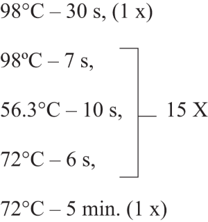 The second PCR was performed to add Illumina adapters with 4 ng of DNA from the first PCR and a final concentration of 0.25 µM of the 5’-TCGTCGGCAGCGTCAGATGTGTATAAGAGACAGGCAACACGatgaccatggcatccag-3’ and 5’-GTCTCGTGGGCTCGGAGATGTGTATAAGAGACAGCACCGGGtacgt
