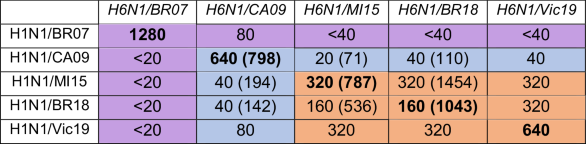 1. NASPA titers for each virus were generated using the indicated ferret antisera (italics) and correspond to the highest dilution factor above the control mean + 3 SD. Titers for NAs matching the antisera are bold. ELLA titers in parenthesis are from a previous study using the same ferret sera and viruses35. Antigenically similar, related, and distinct NAs based on two-way test results are highlighted in orange, light blue, and purple, respectively.