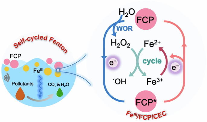 Fenton technology is widely recognized as a well-established method for wastewater remediation, leveraging reactive oxygen species (ROS) generated through the catalytic interplay between hydrogen peroxide (H2O2) and FeII to degrade pollutants1. However, persistent challenges including continuous H2O2 consumption and sluggish FeII regeneration from FeIII reduction have constrained the advancement of conventional Fenton processes2,3,4. To address these limitations, the concept of self-cycled Fenton (SC-Fenton) systems has emerged, designed to concurrently regenerate FeII and synthesize H2O2 within an integrated redox framework. These closed-loop systems enable sustained pollutant degradation while minimizing reagent replenishment, attracting considerable research interest in sustainable water treatment5. Early implementations of SC-Fenton systems primarily integrated photocatalytic or piezocatalytic mechanisms with FeIII activation6,7. Theses hybrid architectures leverage photo/piezocatalytic effects to achieve charge carrier (electron (e–) and hole (h+)) separation, wherein the generated e– concurrently participate in two critical processes: (1) oxygen reduction to H2O2 (ORR-H2O2, Eqs. 1), and (2) FeIII reduction to FeII. The regenerated FeII subsequently reacts with in situ formed H2O2 to perpetuate the Fenton cycle8,9. However, such configurations suffer from two inherent limitations that constrain catalytic efficiency: First, competitive e– consumption between ORR-H2O2 and FeIII reduction creates a kinetic bottleneck, diminishing the availability of e– for either pathway. Second, the ORR-H2O2 process exhibits intrinsically low yield due to limited dissolved oxygen concentrations in wastewater matrices, imposing fundamental constraints on system scalability10. These interdependent challenges–e– pathway competition and oxygen-dependent H2O2 synthesis–collectively restrict the performance of FeIII-mediated photo/piezocatalysis-driven SC-Fenton (Fig. 1a).
