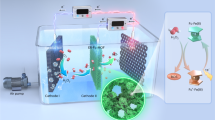 While FeIII generated through the Fenton reaction in the FeII/FEP/CEC (Eq. 14) was reduced to FeII via CE electrons55, a critical operational distinction arises: the FeII/FEP/CEC system starts with preloaded FeII, whereas H2O2 accumulates progressively during the reaction. This stoichiometric mismatch creates an excess of FeII relative to H2O2 availability, triggering parasitic •OH quenching through FeII–•OH interactions (Eq. 15)56, which diminishes oxidative efficiency. Conversely, the FeIII/FEP/CEC maintains controlled FeII regeneration without iron overaccumulation, thereby suppressing radical scavenging pathways. This mechanistic divergence underpins the enhanced degradation performance of FeIII/FEP/CEC over its FeII counterpart. Furthermore, dose-independent kinetic studies further demonstrated non-proportional behavior, where increasing FeCl3 concentrations from 1 mM (kobs = 0.125 min–1) to 2 mM (kobs = 0.146 min–1) resulted in only 16.8% rate enhancement. The sublinear increase implies competitive •OH consumption by surplus FeII at elevated catalyst loads, highlighting the necessity for optimizing FeCl3 dosage to maximize system efficacy. Although the reaction between H2O2 and FeIII could generate •OOH and lead to the formation of 1O2 for pollutants degradation1,45, this sluggish reaction was deemed too slow to be considered the primary reduction pathway (Eq. 16). Besides, the H2O2 decomposition process exhibited direct proportionality to fresh FeII generation rates, as evidenced by the system-dependent hierarchy: FeIII/FEP/CEC displayed maximal H2O2 consumption (the reduction of H2O2 yield between FEP/CEC and FeIII/FEP/CEC, Δ[H2O2] = 0.55 mM) concurrent with peak FeII accumulation (0.14 mM), followed by FeIII/PTFE/CEC (Δ[H2O2] = 0.28 mM; FeII = 0.09 mM) and FeIII/PVDF/CEC (Δ[H2O2] = 0.05 mM; FeII = 0.03 mM). These quantitative correlations confirm the operational SC-Fenton mechanism wherein H2O2 undergoes continuous decomposition through FeII-catalyzed reactions, sustaining redox cycling between FeIII/FeII states. (Supplementary Fig. 9). Consequently, the cycling process between FeIII and FeII was divided into two steps: (i) the FeIII acquired one CE electron and reduced into FeII, and (ii) the FeII promptly activated the generated H2O2 and transformed back into FeIII.