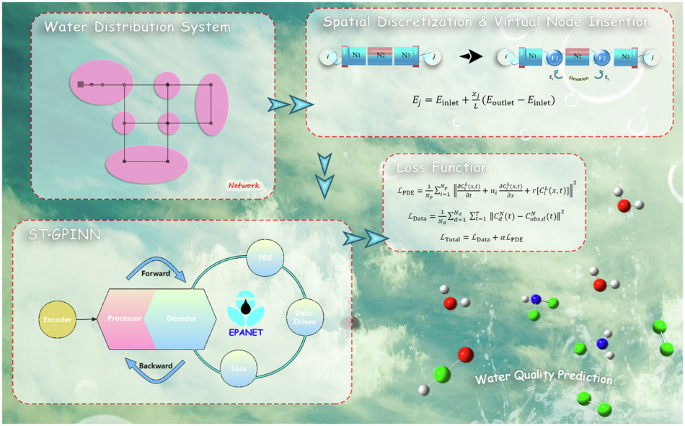 To address these issues, graph-based models like graph neural networks (GNNs) have been proposed to incorporate the spatial relationships between network components26,27. Unlike traditional models that treat each pipe or node as an independent unit, GNNs model the WDS as an integrated graph structure, enabling information to propagate along connected edges. This enables the model to capture long-range dependencies, dynamic flow interactions, and contamination spread paths that are difficult to represent using conventional numerical schemes. Recent advancements in GNN applications for water quality predictions have shown promising results. Salem et al. proposed both static and dynamic GNN prediction models for chlorine levels in real WDSs, demonstrating high accuracy across various sensor configurations28. Li et al. utilized a gated graph neural network (GGNN) incorporating hydraulic flow and network topological information for real-time water quality forecasting5. In particular, spatio-temporal graph convolutional networks (ST-GCNs)29,30 can help capture both spatial and temporal dependencies in nodes and links, enhancing the model’s ability to predict water quality changes over time31. Integrating PINNs with GNNs would make it possible to obtain more accurate and efficient water quality predictions. The GNN component captures spatial dependencies across the network, while the PINN component incorporates governing physical laws, resulting in a hybrid model that leverages the strengths of both approaches.