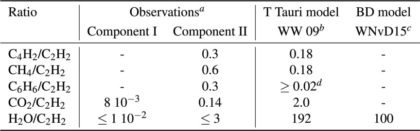 Extended Data Table 1 Observed column density ratios of various species compared with disk models with solar C/O elemental ratio in the gas-phase