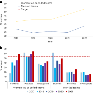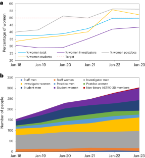 The data that support the figures within this paper and other findings of this study are part of the ASTRO 3D membership database available from https://astro3d.org.au/membership/find-a-member/. The change in membership and fraction of women in ASTRO 3D over time is in the ASTRO 3D annual reports publicly available from https://astro3d.org.au/annual-reports/. The ASTRO 3D hiring guidelines and the ASTRO 3D equity and inclusion action plan are available at https://astro3d.org.au/diversity/astro-3d-equity-and-diversity-resources/. Aggregate, non-confidential data may be available from the corresponding author upon request if approved by the ASTRO 3D Executive Committee.