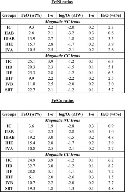Extended Data Table 2 FeO contents, fO2, and minimum water contents of the parent bodies of NC and CC magmatic iron meteorites based on Fe/Ni and Fe/Co ratios of their parent cores