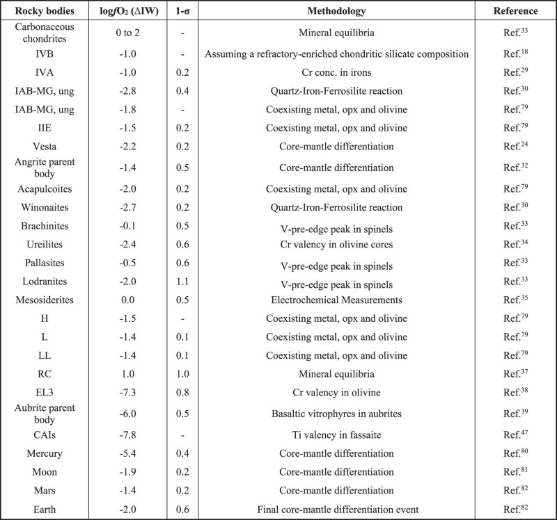 Extended Data Table 4 Oxidation states of rocky bodies in the solar system