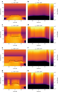 Climatological water vapour mixing ratios in the Martian atmosphere (left) and corresponding modelled hydrogen mixing ratios (right) for all Ls ranges of MY34 covered in this study. Black lines indicate the hygropause.