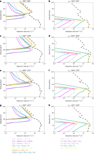Globally averaged hydrogen formation rates and rates that lead to the reformation of water versus altitude for relevant reactions as calculated by the KINETICS model for four Ls periods as given in Fig. 2.