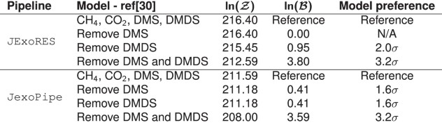 Extended Data Table 3 Bayesian model comparison for dimethyl sulfide (DMS) and dimethyl disulfide (DMDS) using published evidences for a model with 4 gases