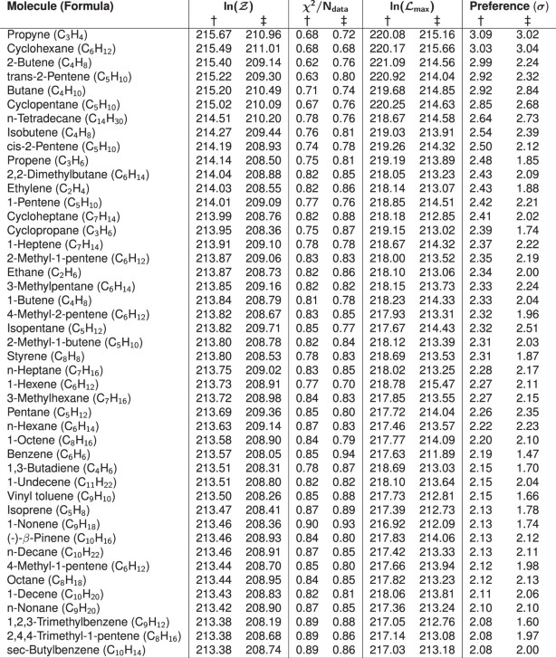 Extended Data Table 4 Bayesian model comparison for hydrocarbon candidates in the atmosphere of K2-18 b (part 1 of 2)