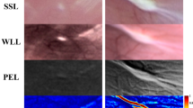The WLE illustrated that the left hemi-supraglottic area showed loss of surface shape regularity and asymmetry to the right normal counterpart (Fig. 3a). The carcinoma in the left hemi-supraglottic area abutting the endotracheal tube was conspicuous due to either paler or darker red appearance than the light-pink normal tissue. However, the left vocal cord (proven cancerous post-operatively) did not show noticeable colour and texture contrast from the normal right vocal cord, with both presenting similar light-pink colour. This is a typical example where the colour/texture appearance manifested by the WLE results in difficulty to differentiate pathologies.