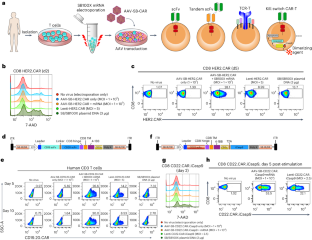 a, Quantification of the HER2.CAR T cell viability. b, Quantification of HER2.CAR-positive CD8 T cells. c, Representative flow-cytometry plots of EGFRvIII.CAR-NK92 cells were produced via either the SB system or lentiviral transduction. d, Quantification of (c). e, Quantification of CD19.20.CAR T cells. f, Flow cytometry detection of CD19 and CD20 expression in NALM6-GL cells. g, Cytolysis analysis of NALM6-GL cancer cells that were co-cultured with lenti-CD19.20.CAR and AAV-SB-CD19.20.CAR T cells. Donor 2 and donor VP2 T cells were used in this figure.