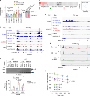a,b, MDA-MB-231 cells virally expressing control or indicated shRNAs (a) or shRNA combined with indicated constructs (b) were subject to immunoblotting of total cell lysates (top) and colony formation assay. Middle, colony numbers as mean ± SD from n = 3 (a) or mean from 2 (b) independent experiments. Bottom, images of cells stained with crystal violet. c, Top, mRNA-seq profiles for CCNA2 in control or AKAP95 KD 293 cells33. The numbers of exon junction reads are indicated. The red asterisk at the gene diagram indicates a stop codon 57 bp downstream of exon 1 in the intron. The number of reads for the junction of exons 1 and 2, and for the average neighbouring exons, and their ratios are in the tables below for indicated cells. d, Total RNAs were used for RT-PCR for intron 1 region in control and AKAP95-KD MDA-MB-231 cells treated with or without cycloheximide for 6 h. Repeated 3 times. e, Relative mRNA levels of UPF in UPF1-KD samples and BTZ in BTZ-KD samples, respectively, each relative to the control samples, as determined by RT-qPCR and normalized to GAPDH. Mean is from 2 independent experiments. f, Relative expression level of TGF-β pathway genes based on RNA-seq reads from control and AKAP95-KD MDA-MB-231 cells expressing vector or AKAP95. Venn diagram shows numbers of TGF-β pathway genes (from GSEA) downregulated by AKAP95 KD and upregulated by rescue with AKAP95 expression, and the relative expression of the 16 overlapped genes in both categories are plotted. One representative analysis from 2 repeats. g, RIP-seq profiles showing AKAP95 binding to RPUSD3 and PPM1K pre-mRNAs. Track information is the same as in Fig. 2c. Red circles indicate the alternatively included exons (corresponding to the middle exon in the gene diagrams in (h), and red boxes show AKAP95 binding at the introns flanking these exons. h, Sashimi plots showing that the alternative splicing of RPUSD3 and PPM1K pre-mRNAs was affected by AKAP95 KD and rescued by restored expression of AKAP95. The numbers of exon junction reads and PSI are indicated. P values by two-sided Student’s t-test for a and b. Uncropped blots and statistical source data are provided as in Source Data Extended Data Fig. 2.