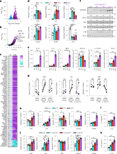 (a) mRNA expression determined by qPCR of THP-1 macrophages treated with indicated doses of nLDL (matched to Fig. 1f) for 24 h (n = 3 biological replicates). (b) Quantification of immunoblots presented in Fig. 1f (n = 3 biological replicates). (c) Secreted cytokines in the media of THP-1 macrophages stimulated with 0.5 mg/ml nLDL for 3 h, 6 h, 24 h relative to cells receiving no treatment for 24 h (Ctr) (matched to Fig. 1e; n = 3 biological replicates) (d) Primary mouse bone-marrow derived macrophages (BMDM) differentiated with GM-CSF were treated with nLDL (0.5 mg/ml) for 24 h and assayed for mRNA expression by qPCR (n = 3 biological replicates), (e) cytokine secretion by ELISA (n = 3 biological replicates), and (f) protein expression in cell lysates by immunoblot (n = 2 biological replicates). Data are mean ± SEM. (a-c) One-way ANOVA and (d) Two-way ANOVA with Benjamini, Krieger and Yekutieli FDR (Q = 0.05), *q < 0.05, **q < 0.01, ***q < 0.001, ****q < 0.0001. e, Student’s t-test (unpaired, two-sided), **p < 0.01. Numerical source data, statistics, exact p values and q values are provided.