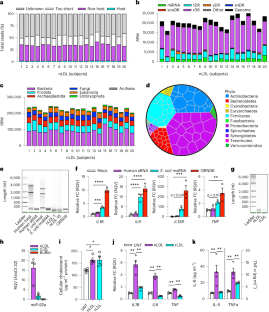 a) Normalized abundance of taxa identified upon alignment of LDL-sRNA to non-host tRNA database (tRNA-db). RPM, reads per million total reads. b) Normalized abundance of bacterial phyla (human microbiome database) contributing sRNA to LDL. c) Normalized abundance of fungal sRNA and representative genomes present on LDL. d) Normalized abundance of algal and protist sRNA and representative genomes present on LDL. RPM, reads per million total reads. Matched nLDL and rLDL samples were fractionated by size-exclusion chromatography (SEC) using two superose-6 columns in tandem and assessed for e) phospholipid and protein content by colorimetric kit (representative data of three independent experiments), f) fluorescence (TopFluor Cholesteryl ester), and g) APOB protein by immunoblot (representative image of three independent experiments). h) Relative expression of exogenous sRNA in matched rLDL and nLDL of a single preparation relative to buffer controls. i) Oil-Red-O staining and fluorescence microscopy (TopFluor Cholesterol ester) (representative images of three biological replicates). Scale bar = 200 μm. Numerical source data, statistics, exact p values and q values are provided.