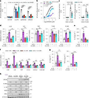 a) HEK293T cells over-expressing human TLR8, UNC93B1 and CD14 were pre-treated with vehicle (DOTAP) or corresponding DNA/LNA oligonucleotides (2.5 μg/mL) for 30 min and then stimulated with TLR8 nucleoside analogue agonist CL075 or TLR8 ORN agonists ssRNA40 or ORN06 (2 μg/mL) for 24 h (n = 5 biological replicates). Two-way ANOVA with Dunnett’s multiple comparison test (statistical significance relative to untreated within each group; **p < 0.0001). b) THP-1 macrophages were pre-treated + /- nt-LNA (1 µg/mL) for 45 min and treated with LPS (500 ng/mL), Poly I:C (1 µg/mL), CL075 (2.5 μg/ml), or ssRNA40 at 1 µg/mL (1:1, nt-LNA:ssRNA40) or 0.2 µg/ml (5:1) for 24 h (n = 3 biological replicates). Relative mRNA expression of IL1B, IL6 and TNF were then assessed by qPCR. For each treatment, the relative fold change of each treatment in the presence of nt-LNA was expressed as a percentage of the relative fold change of each treatment without nt-LNA pre-treatment (% inhibition). Two-way ANOVA, Benjamini, Krieger and Yekutieli FDR (Q = 0.05), **q < 0.01. c-d) Primary human CD14 + PBMC differentiated with GM-CSF and IFNγ were pre-treated with 2.5 μg/mL nt-LNA or vehicle (DOTAP) for 30 minutes and then stimulated with or without ssRNA40 (0.5 μg/mL) for 24 h. c) mRNA expression was quantified by qPCR (n = 4 biological replicates) d) Cytokine (IL-6) secretion was quantified by ELISA (n = 4 biological replicates). One-way ANOVA with Dunnett’s multiple comparison test. **p < 0.01. ***p < 0.001, ****p < 0.0001 (e) mRNA expression (n = 4 biological replicates), (f) cytokine secretion (n = 3 biological replicates) and (g) immunoblotting (representative image of three independent experiments) of BMDMs following up to 24 h treatment with IFNγ (100 U/mL) +/- 0.5 mg/ml nLDL in the presence or absence of 2.5 μg/mL nt-LNA. Two-way ANOVA, Benjamini, Krieger and Yekutieli FDR (Q = 0.05), *q < 0.05, **q < 0.01. Data are mean ± SEM. Numerical source data, statistics, exact p values and q values are provided.