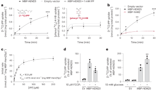 a, Immunoblot for MBP-Hem25p, MBP-SLC25A38, and MBP-Yhm2p in E. coli membranes preparations. b, Steady-state kinetics of [1-14C]-IPP uptake in cells expressing MBP-Hem25p or the empty vector. Initial rates (nmol/min) values represent the mean ± SD of three biologically independent samples. c, Time course of 50 µM [phenyl-14C6]-4-HB uptake by E. coli cells expressing the Pseudomonas putida PcaK or the empty vector (*p = 0.0002, **p = 0.0042, ***p = 0.0006, ****p = 0.0011 empty vector vs pcaK, mean ± SD, n = 3 biologically independent samples, two-sided Student’s t-test). Source numerical data and unprocessed blots are available in source data.
