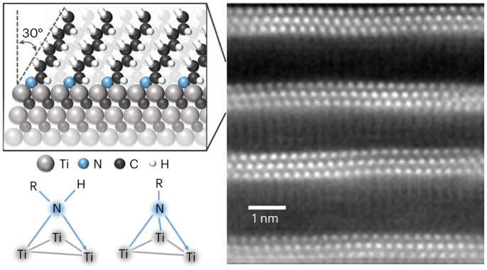 a, Representative snapshots of propyl groups bond to surface Ti atoms in amido and imido motif, respectively. b. Representative snapshots of propyl or octyl amido/imido groups bond to surface Ti atoms with tilt angle calculated to be 34° and 35°, respectively.