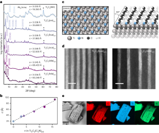 SEM and LAADF-STEM images of a, alkylamine-, b, diamine- and aromatic-amine-modified h-MXenes (scale bar in STEM images is 2 nm). The systematically smaller d-spacings measured from STEM images in comparison with powder X-ray diffraction patterns is attributed to electron beam-induced damage and strain in bended h-MXene stacks used for imaging, as confirmed by cryo-STEM imaging of microtomed h-MXene samples which showed much better agreement of interlayer distances with powder XRD data (Extended Data Fig. 5a–c). c, SEM images of PEG-amine-modified h-MXenes. d, SEM images of Ti3C2(bua)2/3 MXenes prepared with n-BuLi as deprotonating agent. e, STEM-EELS elemental analysis (line scan) of Ti3C2(dda)2/3 MXene.