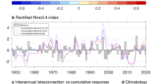 We use ENSO peak season (December, January, February, [DJF]) Niño3.4 (5° S–5° N, 170° W–120° W) sea surface temperature (SST) index to depict ENSO. Seasonal SST anomalies are constructed in reference to the climatology over the 1900–1999 period and quadratically detrended. Most models simulate a reasonable spatial pattern (Extended Data Fig. 5a) and nonlinear properties of ENSO, for example, positively skewed SST anomalies in the eastern equatorial Pacific, which extends to the Niño3 region (5° S–5° N, 150° W–90° W; Extended Data Fig. 5b,c). The positive skewness means that the amplitude of warm El Niño anomalies is larger than cold anomalies of La Niña, principally governed by the nonlinear Bjerknes feedback51 by which, once El Niño warm anomalies establish atmospheric deep convection, they trigger a nonlinear wind response to further warm anomalies52,53. This process is facilitated and amplified by thermocline and zonal advective feedbacks involved in the Bjerknes feedback. Due to the El Niño–La Niña asymmetry, wind anomalies of El Niño and La Niña do not completely offset but rectify onto the mean state47,54,55.