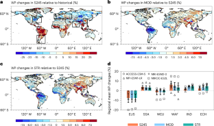 (a), The relative changes of annual mean WPD during 2040–2049 under S245 relative to the historical period. (b)-(c), The relative changes of annual mean WPD during 2040–2049 under MOD and STR relative to S245. Hatched regions have changes with high inter-model agreement defined as at least three of the four models agreeing on the sign of changes. (d), Regional mean relative changes of annual WPD during 2040–2049 under the S245 (red bars), MOD (blue bars), and STR (green bars) scenarios relative to the historical period. The black error bars represent one standard deviation of four climate models. The hatched red (blue and green) bars have changes with high inter-model agreement during 2040–2049 under S245 (MOD and STR) relative to the historical period (S245).