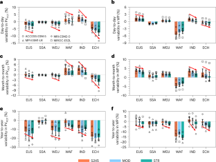 (a), (c), and (e), Day-to-day, month-to-month, and year-to-year variability of solar \({{PV}}_{{POT}}\) in the historical period (units: %). (b), (d), and (f), same as left panels but for WP.