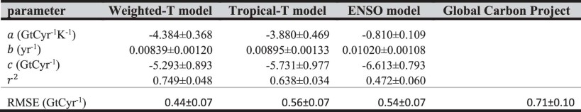 Extended Data Table 3 Regression results and performance metrics for various model configurations with special treatment of the Pinatubo eruption years