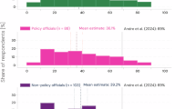 The approval of pro-climate norms and the demand for political action are deliberately measured in a general manner to account for the fact that suitable concrete mitigation strategies may differ across countries. Our general measures strongly correlate with the approval of specific pro-climate norms and the demand for concrete policy measures (Methods). In a representative US sample, individuals who approve of the general norm to act against climate change are substantially more likely to state that individuals ‘should try to’ avoid fossil-fuel-based means of transport (car and plane), restrict their meat consumption, use renewable energy or adapt their shopping behaviour (correlation coefficients ρ between 0.35 and 0.51, all P < 0.001 for two-sided t-tests, N = 1,994; Supplementary Table 2). Similarly, the general demand for more political action is strongly correlated with demand for specific climate policies, such as a carbon tax on fossil fuels, regulatory limits on the CO2 emissions of coal-fired plants, or funding for research on renewable energy (ρ between 0.49 and 0.59, all P < 0.001 for two-sided t-tests, N = 1,996; Supplementary Table 3).