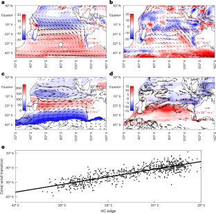 Extended Data Fig. 6 Southward expansion of ocean circulation, the Hadley Cell (HC), and wind stress.