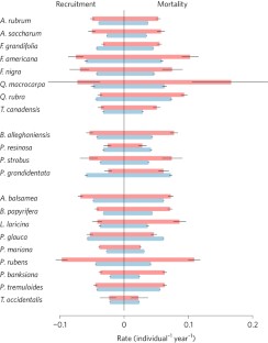 Global climate change is already having an impact on species ranges. For species with slow demography and limited dispersal, such as trees, lags between climate change and distribution shifts are likely to increase in the future. Such lags can be of critical importance to management and biodiversity of forests, because they can result in ‘extinction debts’, where populations temporarily persist under unsuitable conditions, and ‘colonization credits’, where suitable locations are not occupied owing to slow demography and limited dispersal. Here we use a range dynamics model based on metapopulation theory to show that the distributions of 21 dominant trees in eastern North America are out of equilibrium with climate and demonstrate both extinction debt and colonization credit. Moreover, lags are more severe at northern range limits, suggesting that range contraction in response to warming temperatures will outpace expansion.
