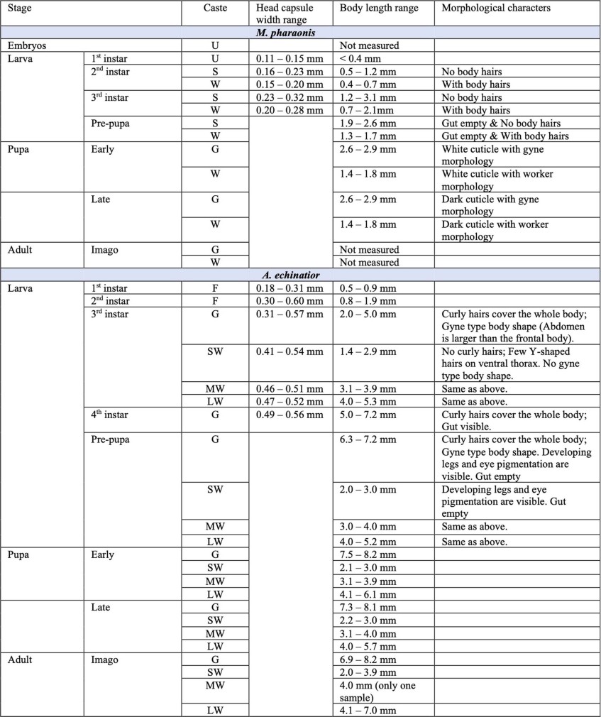Extended Data Table 2 Determination of developmental stages and caste identities in the two ant species